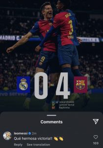 »Que hermosa victoria», escribió el capitán del Inter Miami y de la Selección Argentina a una publicación que realizó el Blaugrana en su cuenta de Instagram en la que se ve el resultado sobre una celebración que incluye a Robert Lewandowski y Alejandro Balde.