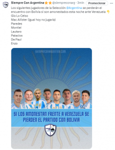 Este jueves 10 de octubre la Selección Argentina enfrentará a Venezuela en Maturín bajo el marco de la fecha 9 de las Eliminatorias Conmebol Sudamericanas para la Copa del Mundo de Estados Unidos, México y Canadá 2026.