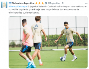 Y como si fuera poco, Valentín Carboni, en el entrenamiento de este miércoles, sintió una molestia muscular y no llega a estar en condiciones para medirse a la Vinotinto. Así que, a lo sumo, integrará el banco de suplentes.